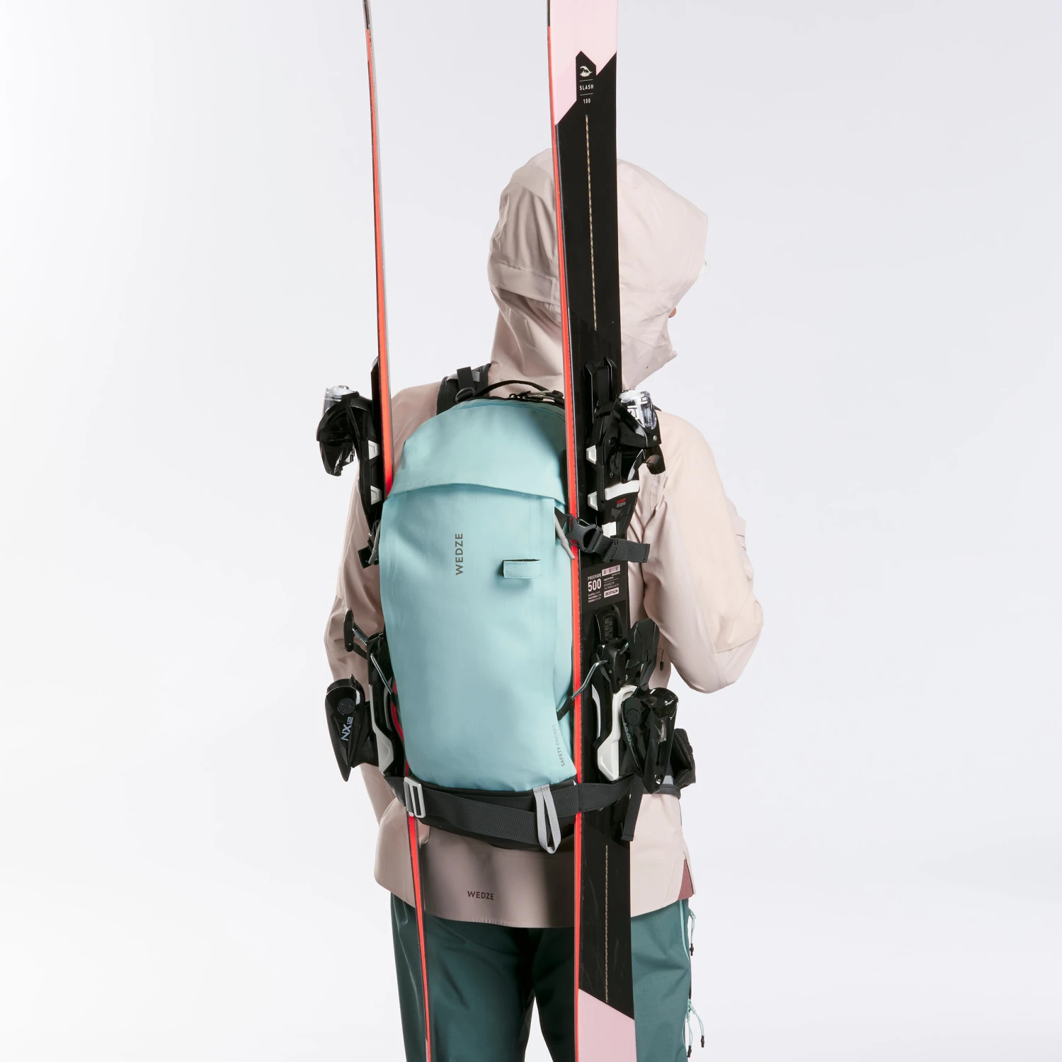 Carrying them this way keeps your hands free so that you can walk comfortably to the ski lifts or get to the Freeride slopes.
