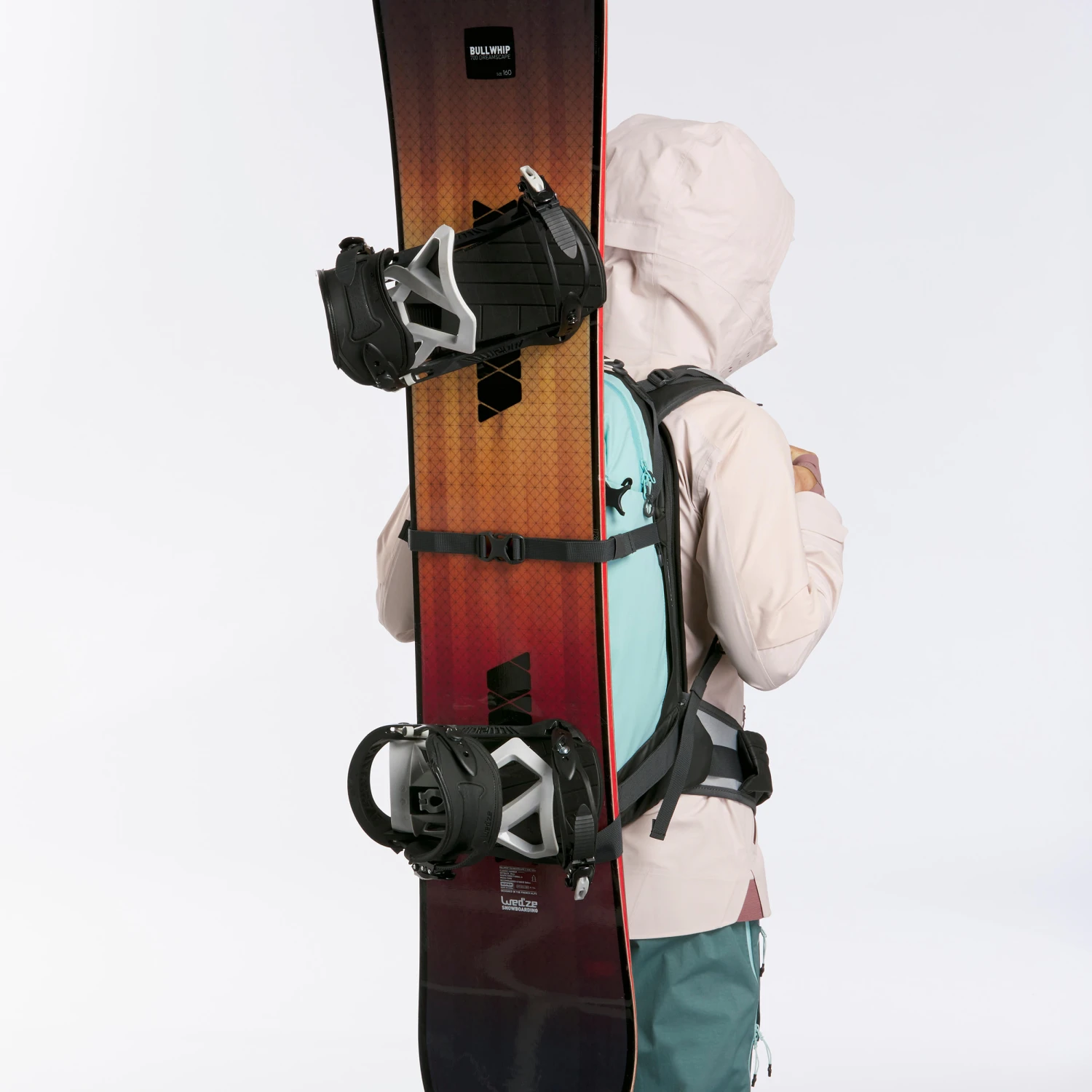 Place the tip of the snowboard on the lower strap at the bottom of your rucksack, undo both side straps and attach them together to finish fixing your snowboard.